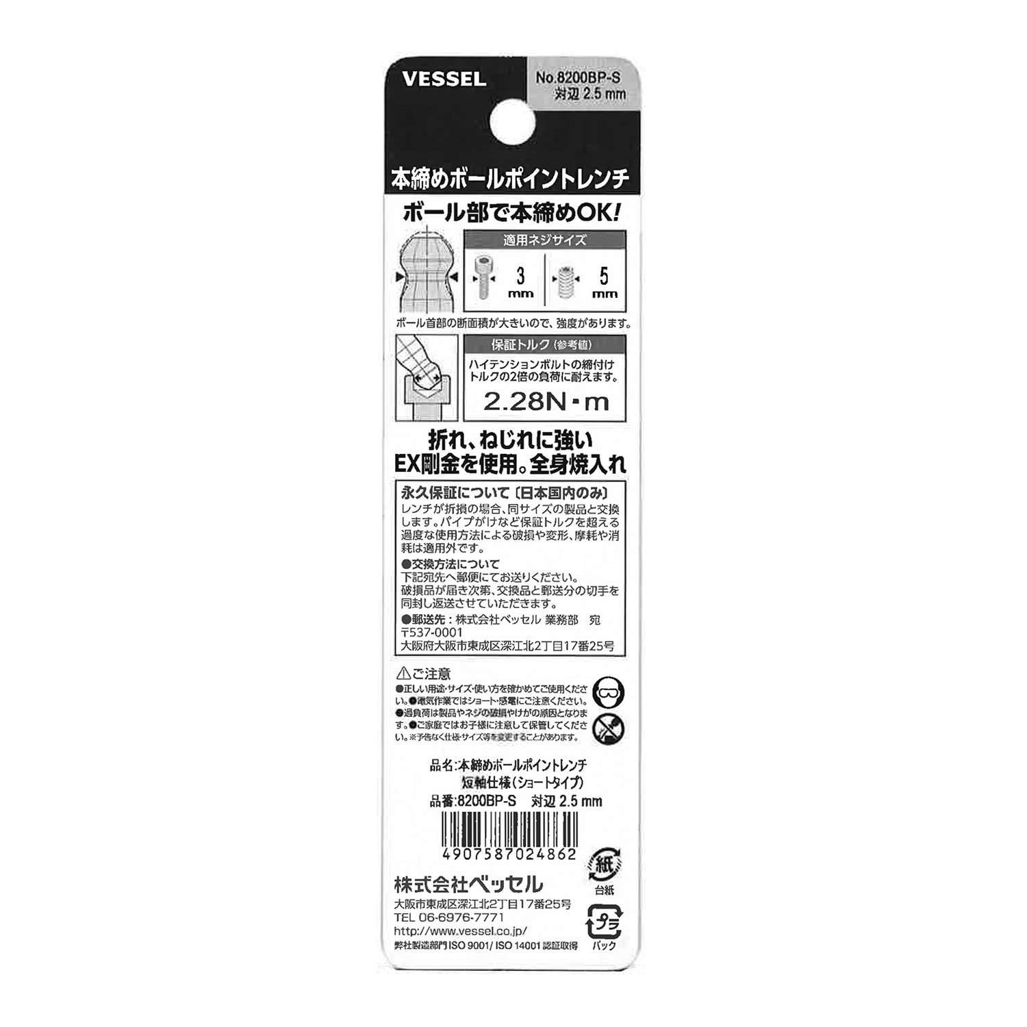 标示 主体总长mm L型扳手的短边尺寸mm 主体重量g 内包装数量 外包装数量 日本JAN条形码