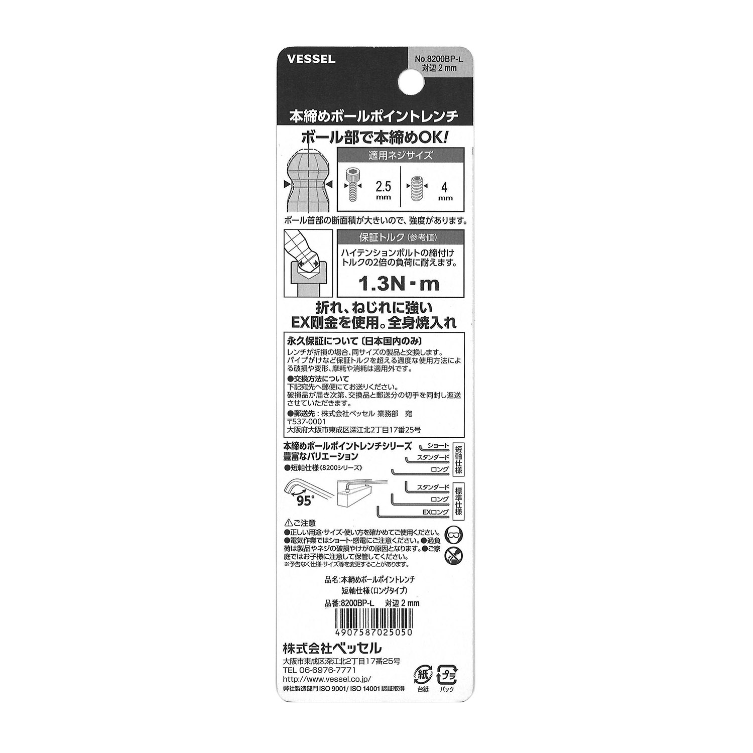 标示 主体总长mm L型扳手的短边尺寸mm 主体重量g 内包装数量 外包装数量 日本JAN条形码
