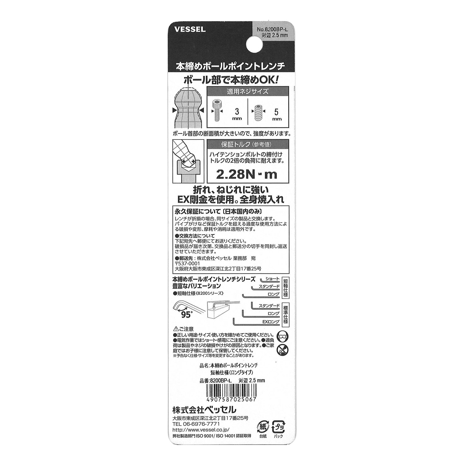 | 标示 | 主体总长mm | L型扳手的短边尺寸mm | 主体重量g | 内包装数量 | 外包装数量 | 日本JAN条形码 |