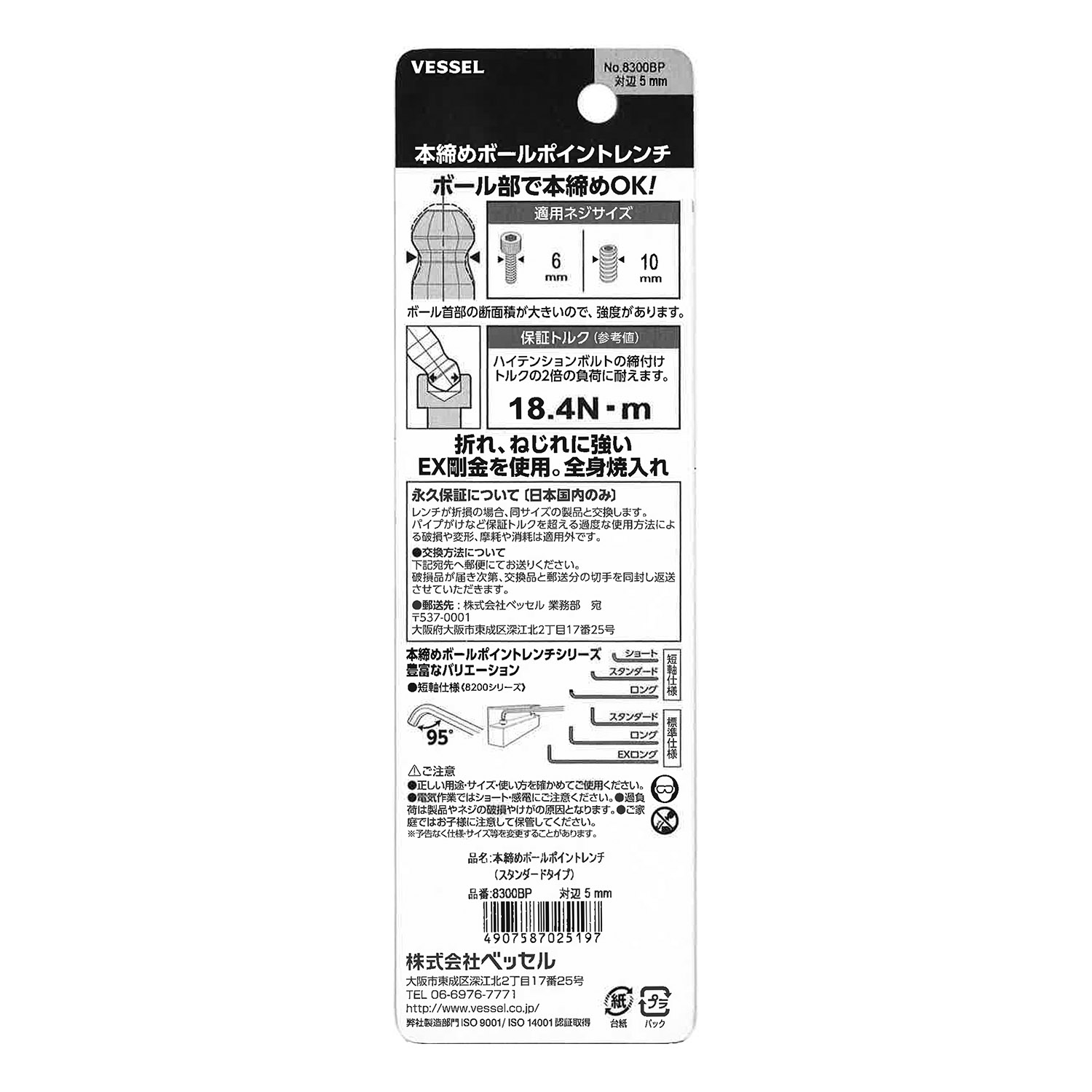 | 标示 | 主体总长mm | L型扳手的短边尺寸mm | 主体重量g | 内包装数量 | 外包装数量 | 日本JAN条形码 |