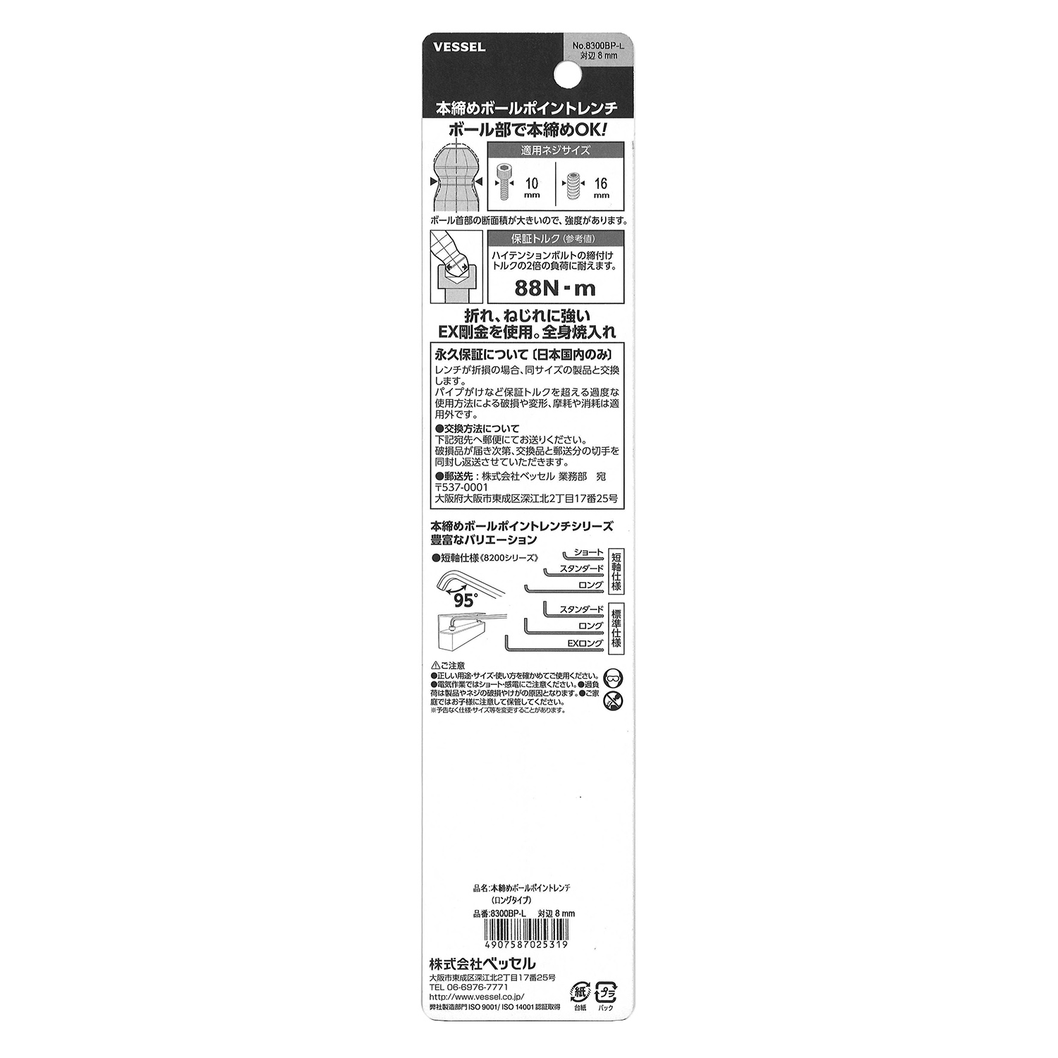 标示 主体总长mm L型扳手的短边尺寸mm 主体重量g 内包装数量 外包装数量 日本JAN条形码